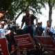Dalam aksinya, massa membentangkan dua spanduk besar.